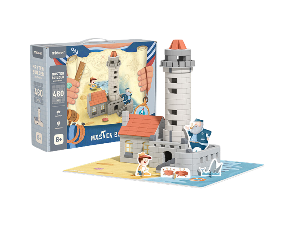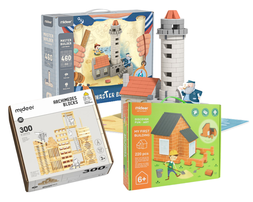Stavebnice Mistr stavitel - tato kreativní stavebnice přenese děti do světa architektury a historie. S pomocí mini-cihliček z přírodního materiálu si mohou postavit slavné stavby, jako je Maják, Mayská pyramida nebo další ikonické památky.
