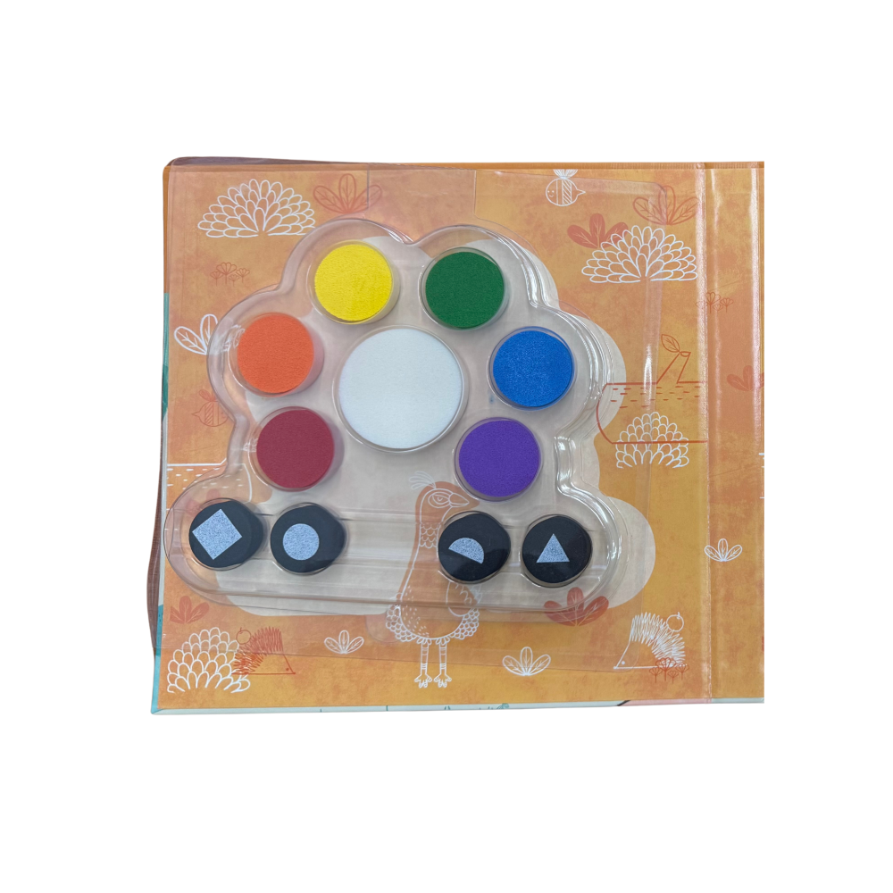 Součástí sady je šest barev, čtyři razítka a omalovánky.
