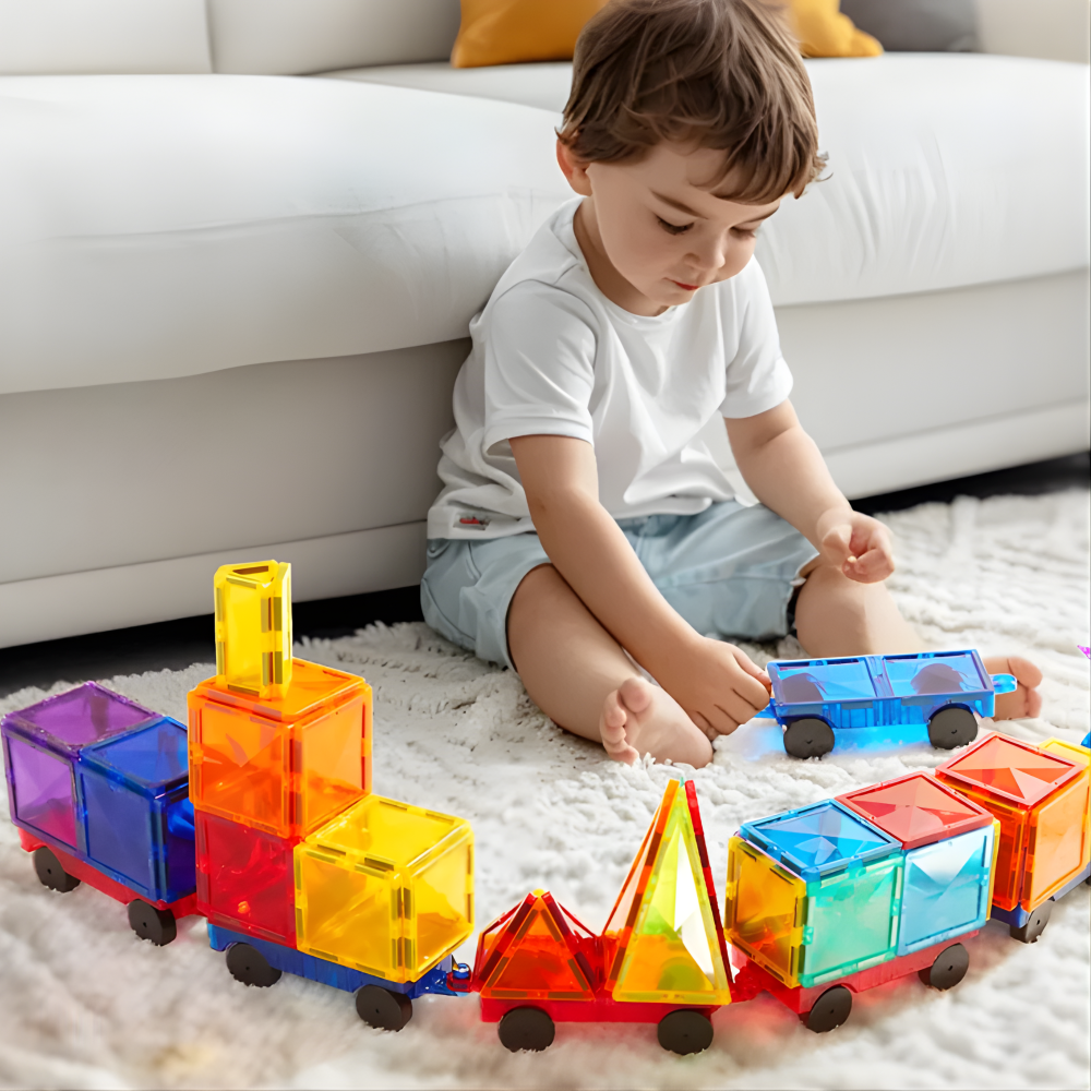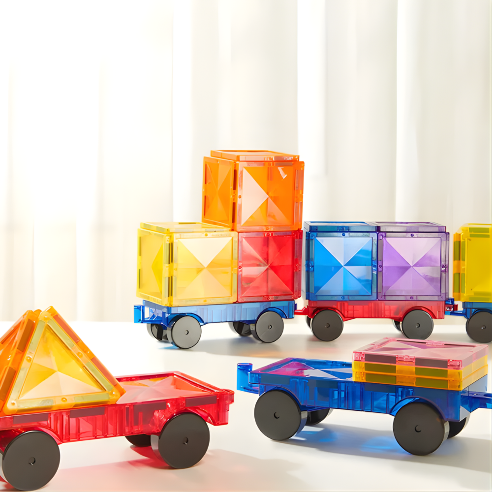 Sada obsahuje dvě robustní a průhledná autíčka v modré a červené barvě, která jsou navržena tak, aby snadno spojovala různé magnetické díly a umožnila stavět pohyblivé konstrukce – od jednoduchých vozidel až po složité dopravní systémy.