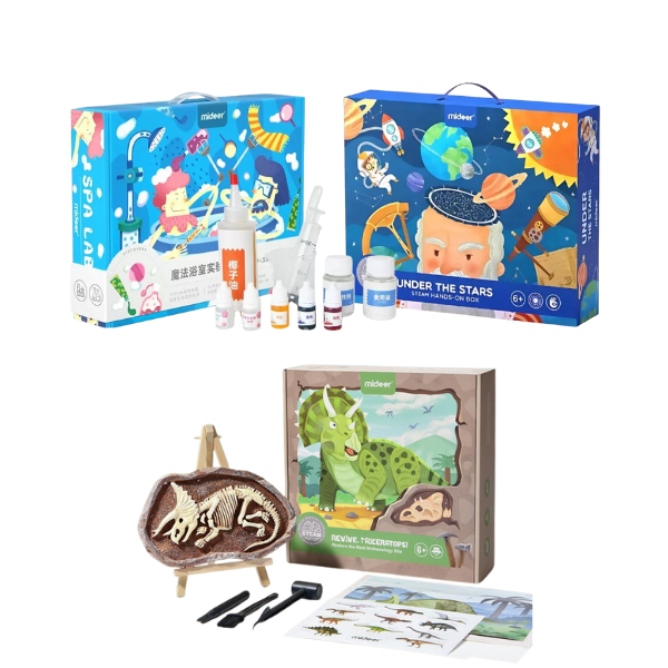 Tato STEM sada pro zvídavé děti spojuje tři fascinující oblasti – vědecké experimenty, vesmírné projekty a archeologické vykopávky dinosaurů