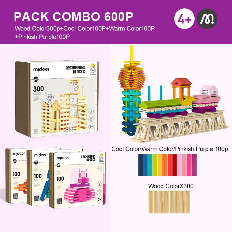 Sada obsahuje 600 pečlivě opracovaných dřevěných bloků v jednotném tvaru, což umožňuje stavět neomezené množství konstrukcí – od jednoduchých domečků přes lodě až po vysoké věže či celé městské scenérie.